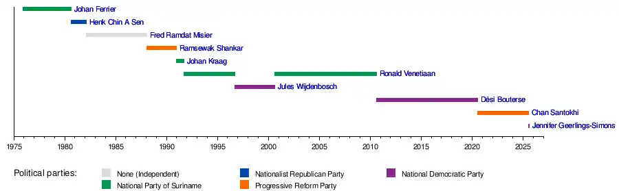 | 9 | | Chan Santokhi (born 1959) | 16 July 2020 | 16 July 2025 | 5 years | VHP | Ronnie Brunswijk (ABOP) |