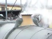 Early safety valves were regarded as one of the engineman's controls and required continuous attention, according to the load on the engine. In a famous early explosion at Greenwich in 1803, one of Trevithick's high-pressure stationary engines exploded when the boy trained to operate the engine left it to catch eels in the river, without first releasing the safety valve from its working load.[8] By 1806, Trevithick was fitting pairs of safety valves, one external valve for the driver's adjustment and one sealed inside the boiler with a fixed weight. This was unadjustable and released at a higher pressure, intended as a guarantee of safety.[9]