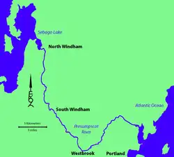 The Presumpscot River (/prɪˈzʌmpskət/)[2] is a 25.8-mile-long (41.5 km)[3] river located in Cumberland County, Maine, United States. It is the main outlet of Sebago Lake. The river provided an early transportation corridor with reliable water power for industrial development of the city of Westbrook and the village of South Windham.[4]