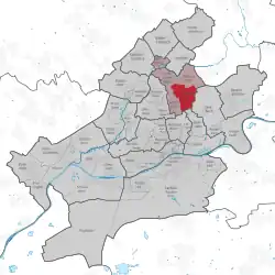 Location of Preungesheim (red) and the Ortsbezirk Nord-Ost (light red) within Frankfurt am Main | |