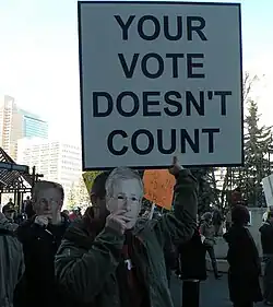 On June 19, 2013, Bill C-309 became law, banning the wearing of masks during a riot or unlawful assembly, carrying a maximum ten-year prison sentence with a conviction of the offence.[3] The Liberal and Conservative parties voted unanimously in favour of the legislation. The Bloc Quebecois, Green Party and NDP cast 96 votes against the bill.[4]