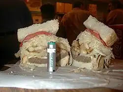 The Primanti Bros. Pitts-Burger sandwich. The AA battery, used as a size reference, is 2 inches (5 cm) tall.