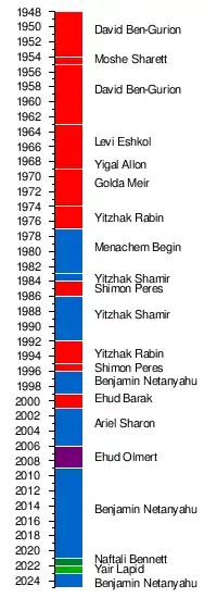 | 13 | Naftali Bennett (born 1972) | | Yamina | 13 June 2021 | 30 June 2022[10] | 2021 (24th) | 36th | Yesh Atid • Blue and White • Yamina • Labor • Yisrael Beiteinu • New Hope • Meretz • United Arab List | |