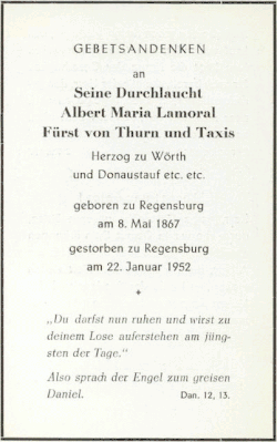 On 22 January 1952 Albert died, at the age of 84, in the St. Emmeram palace at Regensburg. His wife Margarethe died three years later on 2 May 1955. They are buried together in the crypt chapel of palace of St. Emmeram, formerly St. Emmeram's Abbey. Today two streets in Regensburg are named after the couple.