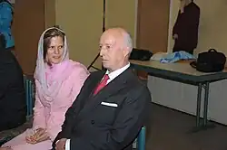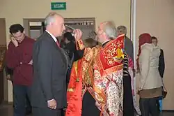 Karl Emich and his supporters argue that the marriage of Maria Vladimirovna's parents was in contravention of the Pauline Laws. They maintain that the House of Bagration-Mukhrani did not possess sovereign status and was not recognized as equal by Nicholas II for the purpose of dynastic marriages at the time of the union of Princess Tatiana Constantinovna of Russia and Prince Constantine Bagration-Mukhransky in 1911, thirty seven years prior to that of Princess Leonida and Grand Duke Vladimir Kirillovich.[9] Therefore, as the next of kin to Vladimir (in the exclusion of his daughter), the Russian Monarchist Party recognises Karl Emich as the heir to the Russian throne, since he and his wife converted on 1 June 2013, from Lutheranism to Eastern Orthodox Christianity, enabling his accession.[14] The couple received Orthodox names of Nikolai Kirillovich and Yekaterina Fyodorovna.