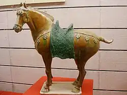 A sancai ceramic horse figurine from the tomb of Li Chongrun, now on display in the Shaanxi History Museum