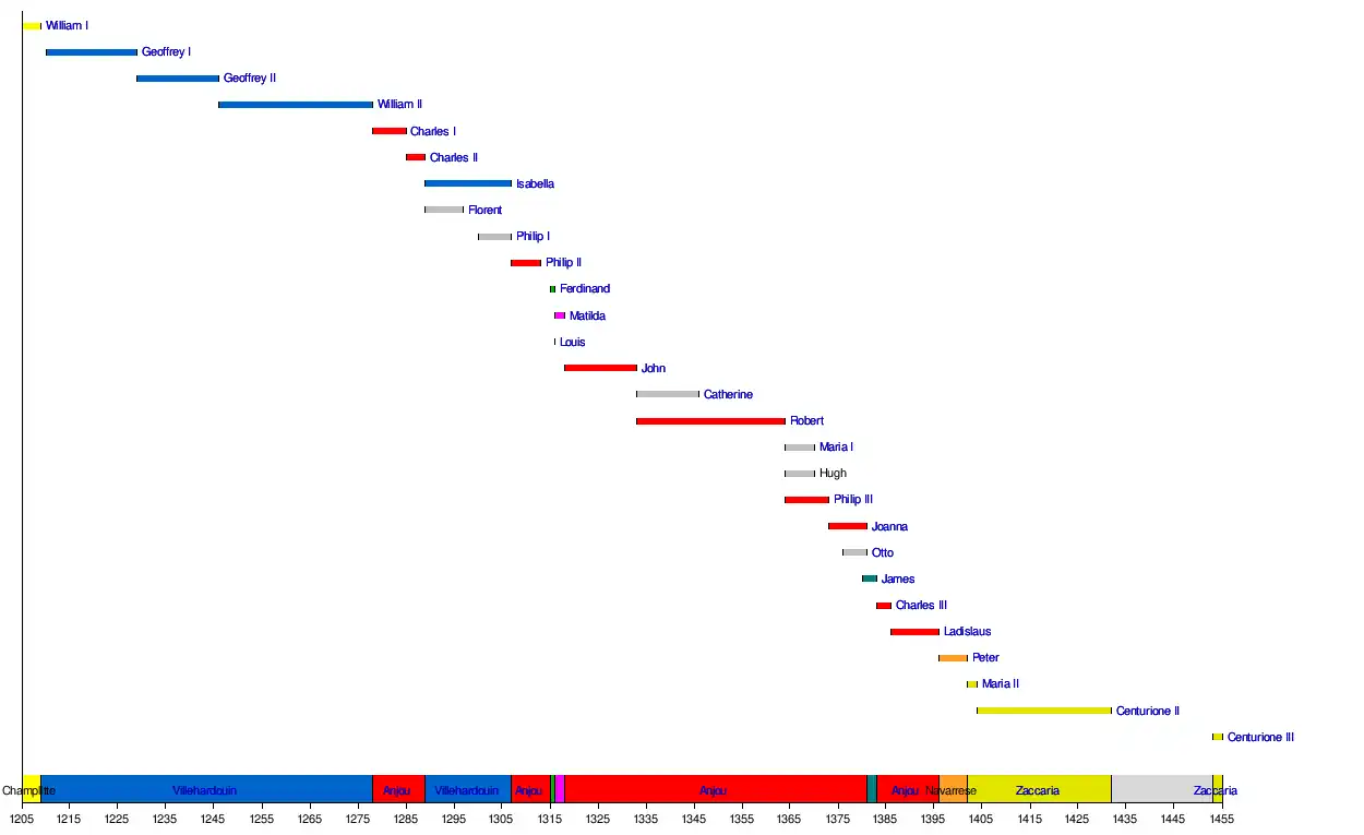 | William II of Villehardouin | c. 1211 Kalamata | Son of Geoffrey I | 1246 – 1 May 1278 | 32 years | 1 May 1278 (aged c. 51) Natural causes | [9] |
