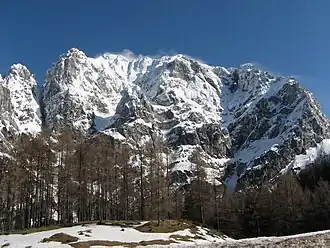 Prisojnik or Prisank is a mountain of the Julian Alps in Slovenia, the 18th tallest peak in the country at a height of 2,547 m. A popular hiking and climbing destination, it is located immediately above the well-traveled Vršič Pass, from where most ascents begin.[2]