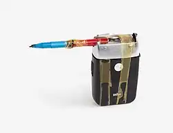 Whilst not illegal, tattooing in United States prisons is against institutional rules and is therefore unregulated. The inmates do not have the proper equipment necessary for the practice. Inmates find ways to create their own tattooing devices out of their belongings and found materials. Improvised tattooing equipment has been assembled from materials such as mechanical pencils, magnets, radio transistors, staples, paper clips, or guitar strings.[2] In addition to the tattooing equipment, the ink utilized also needs to be improvised—potentially consisting of ink taken from pens, melted plastic, soot mixed with shampoo, and melted Styrofoam. Prison tattoos are not generally applied free of charge; they are usually done in exchange for food, stamps, cigarettes, phone time, canteen items, or favors, such as sex or targeted violence.