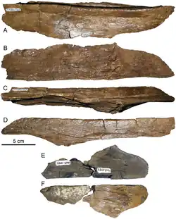 The holotype, MOR 2919, was found in a layer of the Judith River Formation dating from the Campanian and being between 79.8 and 79.5 million years old, plus or minus two hundred thousand years. It consists of a partial skeleton with skull, of an adult individual. It contains the right premaxilla, both maxillae, the left jugal, a part of the right lacrimal, the rear of a left nasal bone, the middle part of a right nasal bone, the skull roof from the frontal bones to the exoccipitals, both squamosals, both quadrate bones, the predentary of the lower jaws, both dentaries, a right surangular, eleven neck vertebrae, eleven back vertebrae, twenty-nine tail vertebrae, nineteen chevron bones, nineteen ribs, the entire pelvis, both lower legs, a right second metatarsal and a right fourth metatarsal. The bones have not been found in articulation.[2]