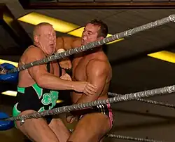 This move, originally called a flying body scissors, was innovated by, popularized and subsequently named after Lou Thesz, sees the attacking wrestler jumping toward a standing opponent, knocking them over their back, sitting on their waist and pinning them in a body scissors. It was initially developed by Thesz as a legitimate move and has since been seen in modern submission grappling contests.[1] A variation, popularized by Stone Cold Steve Austin, is done in reverse; the attacking wrestler performs the Thesz press on a charging wrestler from a standing position, then instead of pinning them, they attack them with mounted punches.