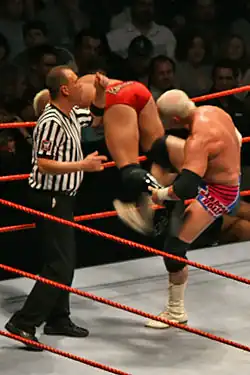 Also known as a knife edge chop, back-hand slice or gyaku suihei chop (English: Reverse horizontal chop) (逆水平チョップ, Gyaku suihei choppu), is the act of a wrestler slice-chopping the chest of the opponent using an upward backhand swing.[1] Many wrestlers, especially brawlers and Japanese wrestlers, use this maneuver, and some crowds (especially American wrestling crowds) respond with a "Woooo!" noise in honor of Ric Flair, who popularized the move.