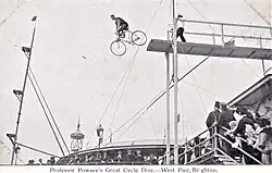 ![]() Postcard of Powsey's bicycle dive from Brighton's West Pier, in 1905 | |