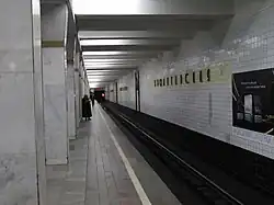 Proletarskaya (Russian: Пролетарская) is a Moscow Metro station in Yuzhnoportovy District, South-Eastern Administrative Okrug, Moscow. It is on the Tagansko-Krasnopresnenskaya Line, between Taganskaya and Volgogradsky Prospekt stations. Proletarskaya opened on 31 December 1966 as part of the Zhadovskiy radius. The station is a typical of the 1960s column tri-span functional design and like many stations built at the time lacks the design and decorative innovations that some of the more famous Moscow Metro stations exhibit. The architects Yuliya Kolesnikova and Yury Vdovin applied a bright theme. The pillars (slightly widening at the top) are revetted with white marble, whilst the floor is covered with grey granite of various tones and with labradorite. The walls are faced with glazed ceramic tiles of white and black (below platform level), which have decorations in the form of hammer and sickles made from anodized aluminium. The station has underground vestibules interlinked with subways under the Krestyanskaya Zastava Square with entrances covered by glazed concrete pavilions. In 1997 a footbridge was built over the northbound line, which serves as a third exit to the common vestibule with the station Krestyanskaya Zastava of the Lyublinsko-Dmitrovskaya Line and also acts as a transfer point. Currently the station has a passenger traffic of 61860 via surface and 120300 via the transfer.