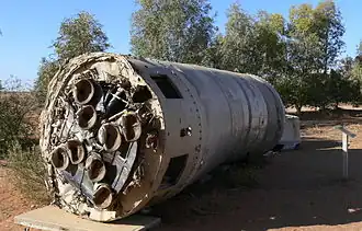 Prospero was launched at 04:09 GMT on 28 October 1971, from Launch Area 5B (LA-5B) at Woomera, South Australia, on a Black Arrow rocket, making Britain the sixth nation to place a satellite into orbit using a domestically developed carrier rocket.[10] The Black Arrow's final stage Waxwing rocket also entered orbit, "rather too enthusiastically", as it continued to thrust after separation and collided with Prospero, detaching one of the satellite's four radio antennae.[11]