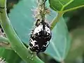 The ground colour of the beetle is bronze with white markings on the elytra. Males have spiny apical elytral angles showing up as a raised ridge along the elytral suture.[1] Like other flower-beetles, adults visit flowers but they are known to sometimes visit beehives and feed on pollen collected.[2]
