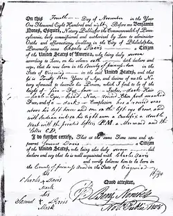 The protection certificate issued on 4 November 1808 in Philadelphia to Charles Davis is good example of an early certificate listing a sailor's tattoos and scars. Davis is described as a citizen of the United States, and a native of Princess Ann County, Virginia. Davis was listed as 23 years of age, five feet four inches, dark hair, hazel eyes, broad nose, round chin, pock marked face, and of dark complexion has a round scar above his left knee and one on the left eyebrow. Davis tattoo's are described as are their locations on his body. He is listed as having in indian ink on his right arm a crucifix, a double heart with printed letters P. M., a mermaid and letters C.D. Charles Davis attested this document by making his X mark as did his witness Samuel Davis.[10][11] "Among tattooed seamen the crucifix inked on Charles Davis was by far the most common religious tattoo, Davis, while illiterate, may have been a Roman Catholic who derived comfort from this symbol of salvation.[12] Author Herman Melville while a sailor aboard the frigate USS United States (1844) was a close observer of nautical life and customs. Melville wrote "the Roman Catholic sailors on board had at least the crucifix pricked on their arm, and for this reason. If they chanced to die in a Catholic land they would be sure of a decent burial in consecrated ground."[13]