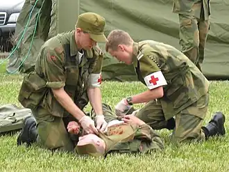The 1864 Geneva Convention establishes that a distinctive emblem should be worn by medical personnel on the field of battle as an indication of their humanitarian mission and their non-combatant status.[3] At that time, the chosen symbol was a red cross on a white background. Muslim nations have objected to this symbol due to its resemblance to the Christian cross. As early as 1876, the Ottoman Empire introduced the Red Crescent as an alternative, less Christian emblem. Additional emblems have been proposed, including the red lion and sun of Persia,[4] the double emblem (both the red cross and red crescent together) by the Red Cross Society of Eritrea, and the red Star of David by Magen David Adom of Israel.