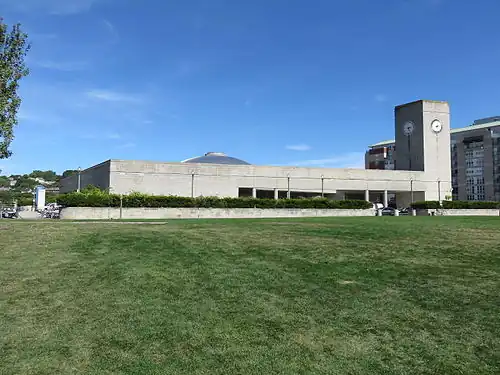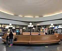 The station was designed in the Washington, D.C. office of Skidmore, Owings and Merrill by Milo Meacham under the direction of Marilyn Jordan Taylor. It is a simple building in the brutalist style, with a large square clocktower. Although largely subterranean and lacking the grand scale that was possible when Union Station was built in 1898, the station has been positively received by critics. The project received a citation in the 1983 Progressive Architecture Awards. Local architectural historian William McKenzie Woodward lauded the building for its aesthetics, calling its saucer dome "an obvious yet very gracious gesture toward the State House".[4] In 2010, Architect praised the forethought of the designers in planning for the revitalization of Providence's downtown, saying that "[i]ts design accommodated the complex geometries of a circulation pattern oriented toward the Capitol and a structure aligned with the tracks, while its splayed plan opened out to what was then an imagined city, one that Providence eventually made happen."[5]