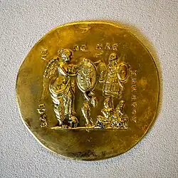 The cities of Macedonia were arranged into the League of the Macedonians (Greek: koinon ton Makedonon), with its seat at Beroea.[64] This league was a continuation of an institution first attested under Philip V.[65] From 27 BC, they used their own "Macedonian era," in which the years were counted from the Battle of Actium in 31/30 BC.[66] In the Imperial period, its main duties related to the Imperial cult, especially the organisation of games in honour of the emperors. It also hosted a local version of the Olympic games, and from AD 229, games in honour of Alexander the Great.[65] From the time of the emperor Claudius until the end of the second century AD, the league minted its own coinage, with the thunderbolt, a traditional symbol of Macedon on the reverse. In the third century AD, the league continued to mint coinage, but with new types, relating to athletic competition.[65] Through this institution, Macedonian identity and loyalty to the Roman emperor were closely aligned.[65]