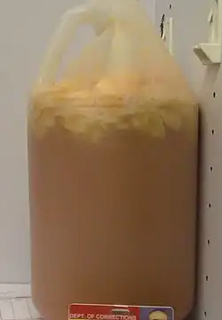 Pruno, also known as prison hooch or prison wine, is a term used in the United States to describe an improvised alcoholic beverage. It is variously made from apples, oranges, fruit cocktail, fruit juices, hard candy, sugar, high fructose syrup, and possibly other ingredients, including crumbled bread.[1] Bread is incorrectly thought to contain yeast for the pruno to ferment. Pruno originated in US prisons, where it can be produced with the limited selection of equipment and ingredients available to inmates. It can be made using only a plastic bag, hot running water, and a towel or sock to conceal the pulp during fermentation. The end result has been described as a "bile-flavored wine cooler".[2] Depending on the time spent fermenting (always balanced against the risk of discovery by officers), the sugar content, and the quality of the ingredients and preparation, pruno's alcohol content by volume can range from as low as 2% (equivalent to a very weak beer) to as high as 14% (equivalent to a strong wine).
