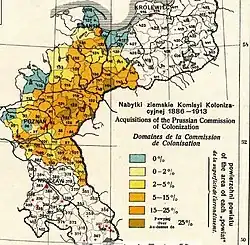 The commission was one of Prussia's prime instruments in the official policy of Germanization of the historically Polish lands of West Prussia (the former Royal Prussia) and the dissolved Grand Duchy of Posen. The Commission ultimately purchased 613 estates from ethnic German owners and 214 from ethnic Poles, functioning to more often bail out German debtors rather than fulfilling its declared national mission. By the end of its existence, a total of 21,886 German families (154,704 persons) out of a planned 40,000 had been settled.[3] The commission's activities had a countereffect in Poles using what has been termed "defensive nationalism",[2] unifying "Polish nationalism, Catholicism and cultural resistance" and triggered countermeasures by the Polish minority.[4] Efforts of new private initiatives by the minority, but actually a majority in wide parts of Posen and West Prussia province, who founded the Prussian banks Bank Ziemski, Bank Związku Spółek Zarobkowych (Vereinsbank der Erwerbsgenossenschaften) and local land acquisition cooperatives (spółki ziemskie)[5] which collected private funds and succeeded to buy more latifundia from defaulted owners and settle more ethnically Polish Germans as farmers on the parcelled land than their governmentally funded counter-party. A big success of the Prussian activists for the Polish nation.