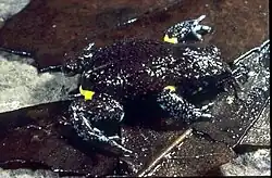 The species is polyandrous, with each female mating with several males. The female visits up to eight males, mates with each, and deposits eggs in the shallow nest he has dug.[10][11][12] As the female releases the eggs in the nest, the male grabs the female by the inguinal amplexus and fertilizes the eggs as they are being released by the female.[9] The female moves on and the male tends to the nest. The nest, which may contain moist leaf litter or sphagnum moss, floods during rain. The eggs hatch and the tadpoles develop in the water. If no sufficient rain happens soon after laying the eggs can remain unhatched for many weeks, with the tadpoles developing inside. The nest must stay wet so the eggs remain moist, but not too wet or they will be washed away. Female frogs that mate with more males, thus depositing eggs in more nest sites, are more likely to have some young survive.[10][11]