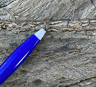 There is an apparent lack of pseudotachylyte in the geologic record relative to the observed seismicity of today,[6][7] which brings into question if this is an issue of the rarity of its production, lack of recognition in the field, or its ability to be preserved.[9] It was once thought that pseudotachylyte could only be produced in dry, crystalline rock,[2] this however, has been shown to be incorrect.[8] Therefore, its production is likely not as rare as originally thought. Pseudotachylyte is often closely associated with other extremely fine grained rocks (e.g. mylonite and cataclasite),[1] and is extremely prone to alteration that often renders it unrecognisable[6][7] which supports arguments that pseudotachylyte production isn't rare, but rather is likely to go unrecognised, and thus unreported.