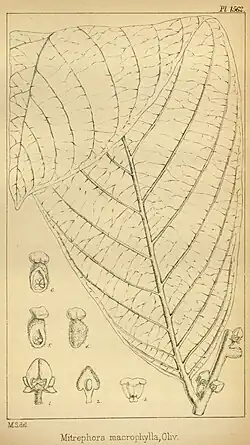 | Botanical illustration of Pseuduvaria macrophylla using the synonym Mitrephora macrophylla | |