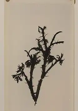 Leafless, dichotomously branching fossils bearing spines and possessing vascular tissue from the Devonian of Gaspé Peninsula, Canada, were thought by Dawson in 1859 to resemble the modern whiskfern, Psilotum. Accordingly, he named his new genus Psilophyton, the type species being P. princeps. Unfortunately, it later turned out that his description and subsequent reconstruction was based on fragments of three different unrelated plants, which caused confusion for many years.[7] The sporangia were from Psilophyton, but some aerial stems were from what is now Sawdonia, and the rhizomes were from Taeniocrada.[17]