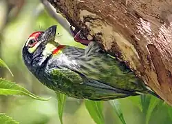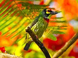 The coppersmith barbet (Psilopogon haemacephalus), also called crimson-breasted barbet and coppersmith, is an Asian barbet with crimson forehead and throat, known for its metronomic call that sounds similar to a coppersmith striking metal with a hammer. It is a resident bird in the Indian subcontinent and parts of Southeast Asia. It carves out holes inside a tree to build its nest. It is predominantly frugivorous, but has been observed eating insects, especially winged termites.