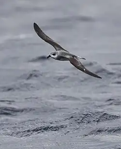 The black-winged petrel is a small species of petrel with long, narrow wings. Its length averages 29 centimetres (11 in) and its wingspan averages 67 centimetres (26 in). It has a small head and short black beak, a slender body and square-cut tail. It has a pale grey cap and nape, white cheeks and a dark grey collar. The dorsal surface of the body is pale grey and the upperside of the wings is pale grey near the base but dark greyish-black along the outer edge. The underparts are white and the outer edges of the wings are black. The tail is barred in black and white.[2]