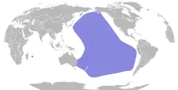 The black-winged petrel is a pelagic species native to the East Pacific Ocean, living out at sea and only coming to land in order to breed. Its breeding range stretches from Lord Howe Island and eastern Australia to New Caledonia, New Zealand (the Kermadec Islands, Three Kings Islands, Chatham Islands)[3] and the Austral Islands (French Polynesia) in the east. The largest colony in the world is on Macauley Island (Kermadec Islands).[3] Outside the breeding season it migrates further north and most commonly occurs in a broad belt of ocean between Peru and Hawaii.[4]