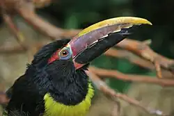The green araçari (Pteroglossus viridis), is a toucan, a near-passerine bird. It is found in the lowland forests of northeastern South America (the Guiana Shield), in the northeast Amazon Basin, the Guianas and the eastern Orinoco River drainage of Venezuela. At 30–40 cm. (12–16 in) long and weighing 110–160 grams (3.9–5.7 oz.), it is the smallest aracari in its range,[3][4] and among the smallest members of the toucan family.