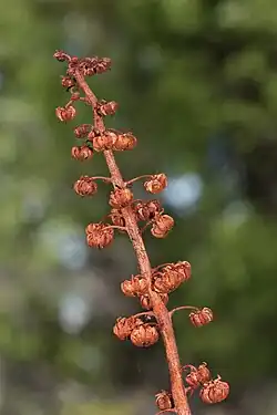 The visible portion of Pterospora andromedea is a fleshy, unbranched, reddish to yellowish flower spike (raceme) 15–170 cm (6–67 in) in height,[4] though it has been reported to occasionally attain a height of 2 meters (6.6 feet).[5] The above-ground stalks (inflorescences) resemble an emerging asparagus spear in shape and are usually found in small clusters between June and August.[6][7] The inflorescences are hairy and noticeably sticky to the touch. This is caused by the presence of hairs which exude a sticky substance (glandular hairs). The inflorescences are covered by leaves that have been reduced to scale-like structures known as bracts that are 2–3.5 centimeters long and 0.5–1 centimeter wide.[4] The lower portion of the flowering stem is tightly covered in bracts and they become more widely spaced higher on the stalk.[8]
