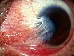 A pterygium of the eye (pl.: pterygia or pterygiums, also called surfer's eye) is a pinkish, roughly triangular tissue growth of the conjunctiva onto the cornea of the eye.[2] It typically starts on the cornea near the nose.[3] It may slowly grow but rarely grows so large that it covers the pupil and impairs vision.[2] Often both eyes are involved.[5]