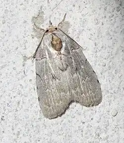 Forewings silvery gray with irregular pale fasciation. Darker flecks found only on costa. The caterpillar is glossy, and light grass green. On each segment, there is faint yellow spot on anterior spiracles. Dorso-lateral tubercles are pale yellow. Pupation occurs in an oval tapered cocoon. Pupa dorso-ventrally flattened and semi-ovoid.[4]