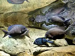 | A single Ptychochromis oligacanthus (lowermost fish with a dark bar on its body) and four Paretroplus menarambo | |