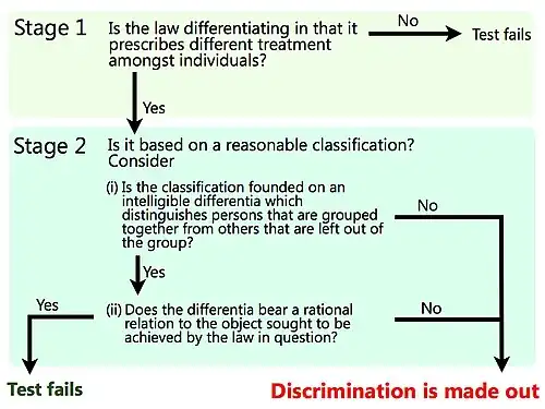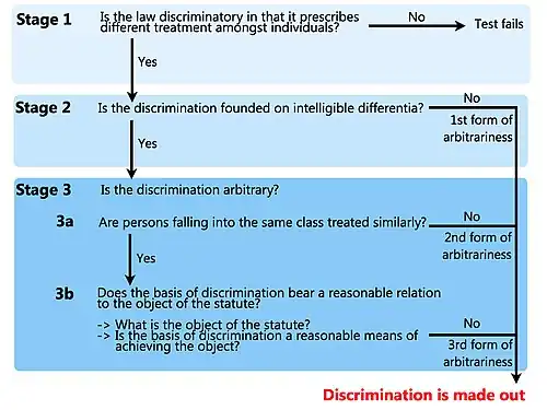 Upon reviewing the lines of Indian and Malaysian cases before him, Karthigesu J.A. reformulated a three-stage test to determine whether a statute or section will contravene Article 12 of the Constitution.[19] The judge's articulation of the test, premised on "elegance and simplicity",[20] sought to address the three forms of arbitrariness as mentioned above. This test is described as follows, and is fully depicted by the diagram on the right:
