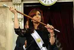 Cristina Kirchner is a highly divisive political figure in Argentina.[11] The Kirchnerite administration used its aligned media and the communication outlets of the state for advocacy of the figures of both Fernández de Kirchner and her husband Néstor Kirchner.[12] This advocacy, which describes the Kirchners as leaders of a revolution, is usually called the "Relato K" (Spanish for K narrative).[12][13] Political life is described as a conflict between good and evil, in a manner similar to religious faith.[14] From this perspective, the "good" side consists of the government and the Argentine people as a whole,[15] while the "evil" side consists of the non-aligned media (mainly the Clarín newspaper), the rural industries, the financial services, the vulture funds,[16] and the imperialism and local Argentines aligned with it.[15] Again according to her detractors all the problems in the Kirchner administration are blamed on those sectors; Kirchnerism never engages in self-criticism.[16] Specific people or organizations may be placed on either the "good" or "evil" side according to the political needs of the time, and the pro-Kirchner network may shift the support or criticism accordingly.[15] Her speeches also resort to appeal to emotion.[11]