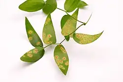 The rust fungus Puccinia myrsiphylli requires 8 hours or more of the leaf being wet in order to infect bridal creeper.[4] Between 16 and 20 degrees Celsius is the optimal infection temperature.[4] However, infection is totally stopped at 25 degrees Celsius.[4] In tests, P. myrsiphylli only develops successfully on A. asparagoides.[4] Every other species tested were unaffected or very resistant to the rust.[4] For P. myrsiphylli to be effective, it needs to attack the bridal creeper's root system because 90% of bridal creeper's biomass is below-ground rhizomes and tubers.[4] The way P. myrsiphylli works is by infecting leaves and stems, which cause heavy defoliation of bridal creeper plants.[4] It limits the nutrients and water available for the host plant's production of vegetation and reproduction.[4] P. myrsiphylli also reduces the photosynthetic surface, which destroys leaf tissue.[4] The rust destroys the capacities of A. asparagoides in 20 weeks.[4] Morin believes it will likely take several years for P. myrsiphylli to decrease the biomass below ground.[4]