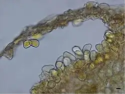 The disease cycle for canna rust has not been fully discovered, but there are several known pieces. Urediniospores (or uredospores), asexual rust spores, have been discovered on the leaf surface.[4] The color of the urediniospore can range from a golden to a yellow-orange, and are egg or pear shaped.[4] The uredospores are responsible for the spread of the rust to new leaf tissue. Uredospores are subglobose to ovoid or pyriform, echinulate, and measure 25.74 to 37.18 x 17.16 to 27.17 μm, with thickened walls apical walls (1.3 to 1.6 μm) and one to two equatorial germ pores. In addition, the overwintering spores that produce basidiospores, also known as teliospores, have been located on the leaf surface.[4] The teliospores range from cylindrical, clavate to club shaped, with rounded apex and sized from 50−83 × 14−21 μm.[5][4] Basidiospores are the sexual spores of rusts. There have been no pycnia or aecia located on Canna Rust.[4] However, P. thaliae has been known to cause rust on several cannabis species and on arrowroot which are other uredial hosts.[6] The pathogen is likely mobile in the plant leaf allowing it to spread across the leaf surface. The overwintering stage occurs during the wet and cold seasons.