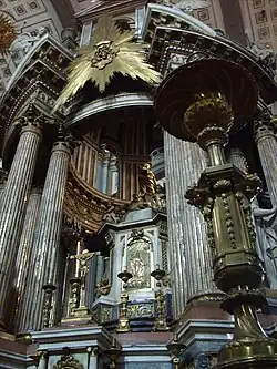 Among the sacred vessels, two gold ones stand out, as well as a monstrance, made by José Inzunza. An elegant tenebrio of 5 and a half meters high in ebony wood richly adorned with silver, the work of José Mariano Castillo.[14]