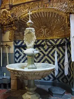 On the sides is "The lavatory" of the painter Luis Berrueco from the 18th century. On the sides of the entrance doors are two ovals, one of Saint Joseph and the other of Archangel Michael, both by the painter Ibarra. In one corner of the large space is a 3 m high tecali marble fountain or ewer.