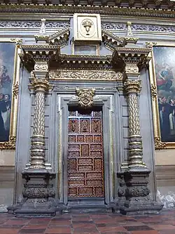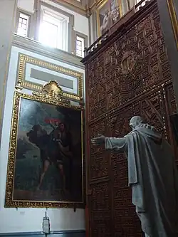 The door that leads to the Plaza Mayor is called San Cristóbal by Saint Christopher who is patron, among other things, of all entrances and exits, since there was behind the door a gigantic statue made of wood of this saint since the inauguration of the cathedral (1649) until the times of the intendant Manuel de Flon Conde de la Cadena (1786-1811) when it was removed, today in its place there is a large-format canvas of the same saint and the statue is kept in the Temple of Santiago.