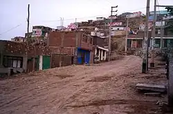 Pueblos jóvenes were estimated to have over one million inhabitants in 1974. They were built on hillsides or beside rivers.[1] By 2008, it was estimated that tens of millions of Peruvians were squatting land.[2] Areas include Comas District, Los Olivos District and Villa El Salvador in Lima.[3][4]