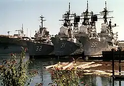 On December 1, 1945, the navy yard's name was changed to Puget Sound Naval Shipyard. After the war, the Naval Inactive Ship Maintenance Facility became a tenant at the shipyard. Until 1998, USS Missouri was moored here, and was for a time open to visitors.[2] Inactive ships today include aircraft carriers, cruisers, destroyers, and submarines. Puget Sound Naval Shipyard has remained active since World War II. During the Korean War, it was engaged in a ship activation program. In 1957, construction of guided missile ships began. Since 1961, Puget Sound has been engaged in the repair of both conventional and nuclear-powered aircraft carriers, surface ships, and submarines.[2]