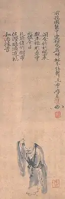 ![]() A depiction of the folkloric Puhua (Fuke in Japanese) in the clouds, ringing his hand-bell with a clapper (called to in Chinese, taku in Japanese). | |