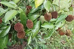 The fruit is ovoid, 5-7.5 cm long, dark red, with its thick, leathery rind closely set with conical, blunt-tipped tubercles or thick, fleshy, straight spines, which are up to 1 cm long.[2] There may be one or two small, undeveloped fruits nestled close to the stem. Within is the glistening, white or yellowish-white flesh (aril) to 1 cm thick, more or less clinging to the thin, grayish-brown seedcoat (testa) which separates from the seed. The flavor is generally much sweeter than that of the rambutan.[2] The seed is ovoid, oblong or ellipsoid, light brown, somewhat flattened on one side, and 2 to 3.5 cm long.