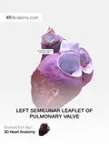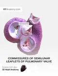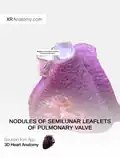 At the apex of the infundibulum, the pulmonary orifice is guarded by three semilunar cusps - two anterior and one posterior, with free edges projecting upward into the lumen of pulmonary trunk. The cusps are named according to their positions during foetal development: the anterior, the posterior, and the septal cusp.[3] The free edge of each cusp presents a fibrous nodule of semilunar cusp at the centre with two lateral thin portions, the lunule of semilunar cusp. Each cusp forms pocket like dilatation called pulmonary sinus at the initial portion of pulmonary trunk.